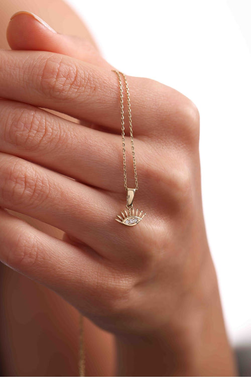 14 Ayar Altın Burgu Detaylı Beyaz Taşlı Göz Kirpikli Mini Kolye Ucu